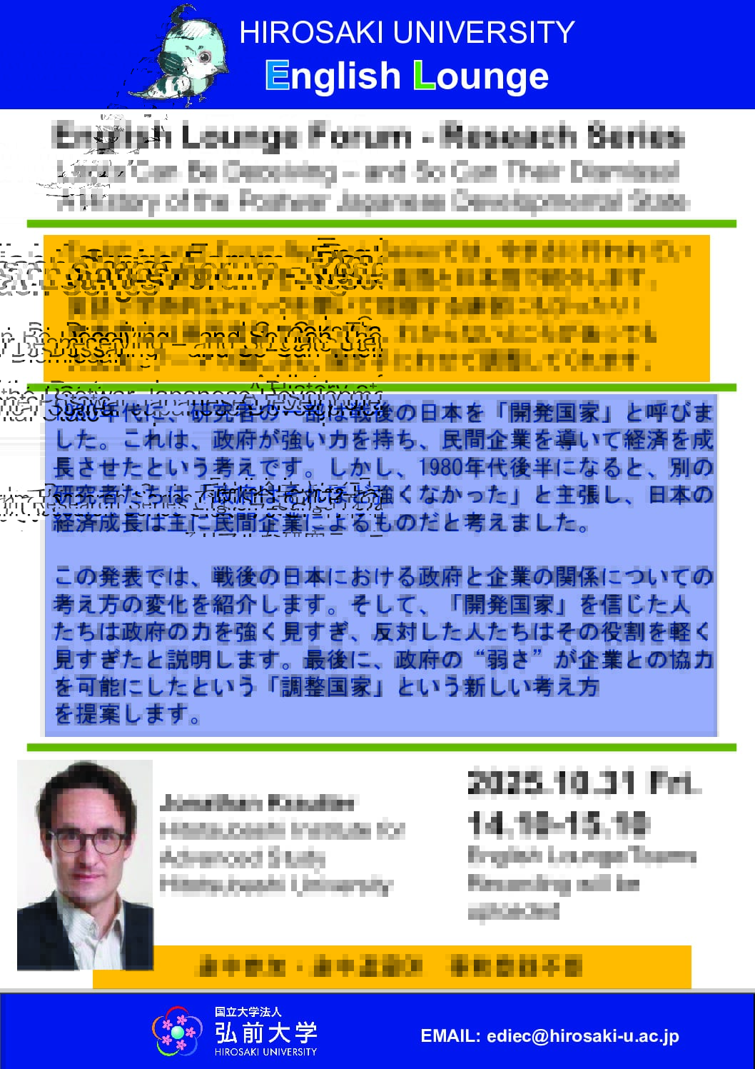 English Lounge Forum Research Seriesでは、今まさに行われているリアルな研究テーマを、やさしい英語と日本語で紹介します。英語で学術的なトピックを聞いて理解する練習にもぴったり!発表者は日英両言語で話すので、わからないところがあっても大丈夫。テーマや難しさも、聞き手にわせて調整してくれます。